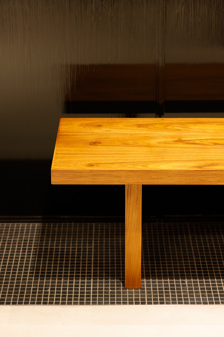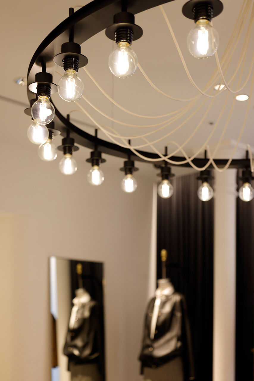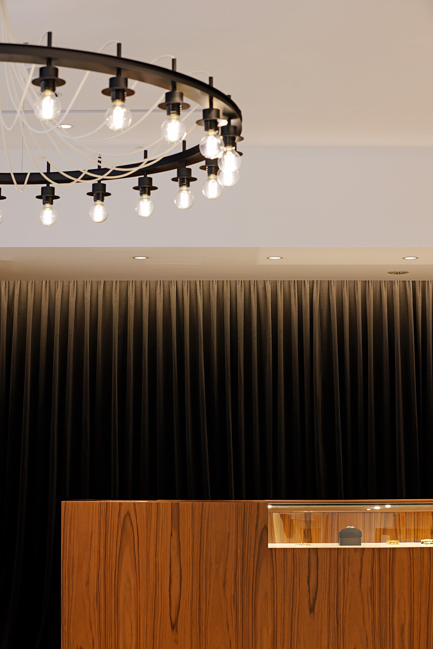 繊細なメタルワークのエントランスサッシュ、飾ることのないモルタル床や電球むき出しのシャンデリアなど、あくまでもチープシックさを担保しながらも、空間のシークエンスや緩急のある照明計画によって、DRAWERブランドらしい華やかさを引き立てている。