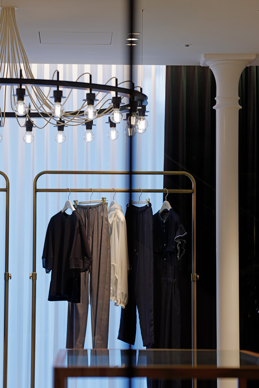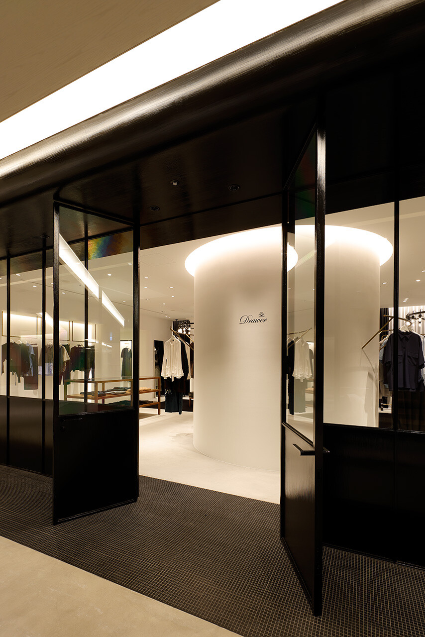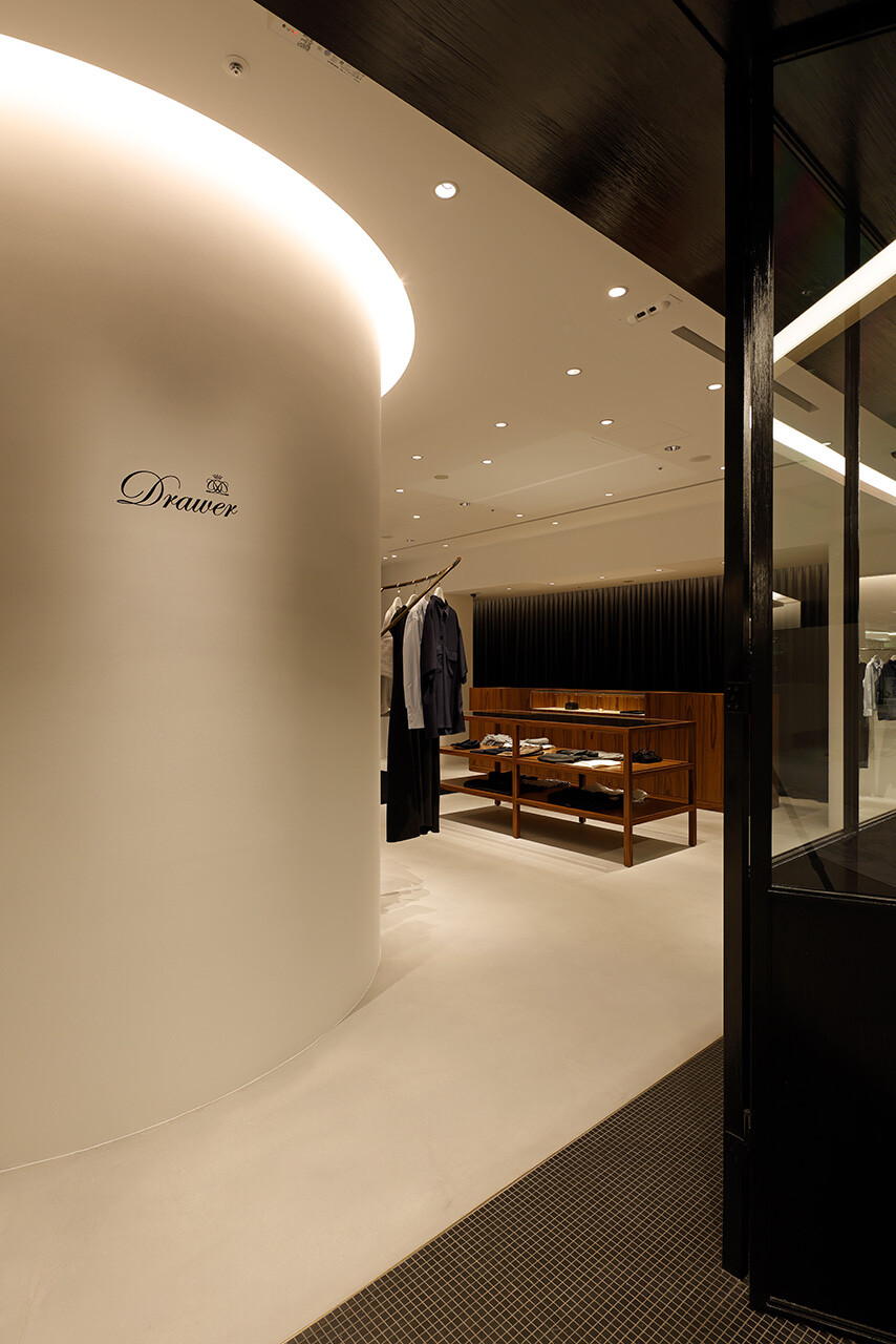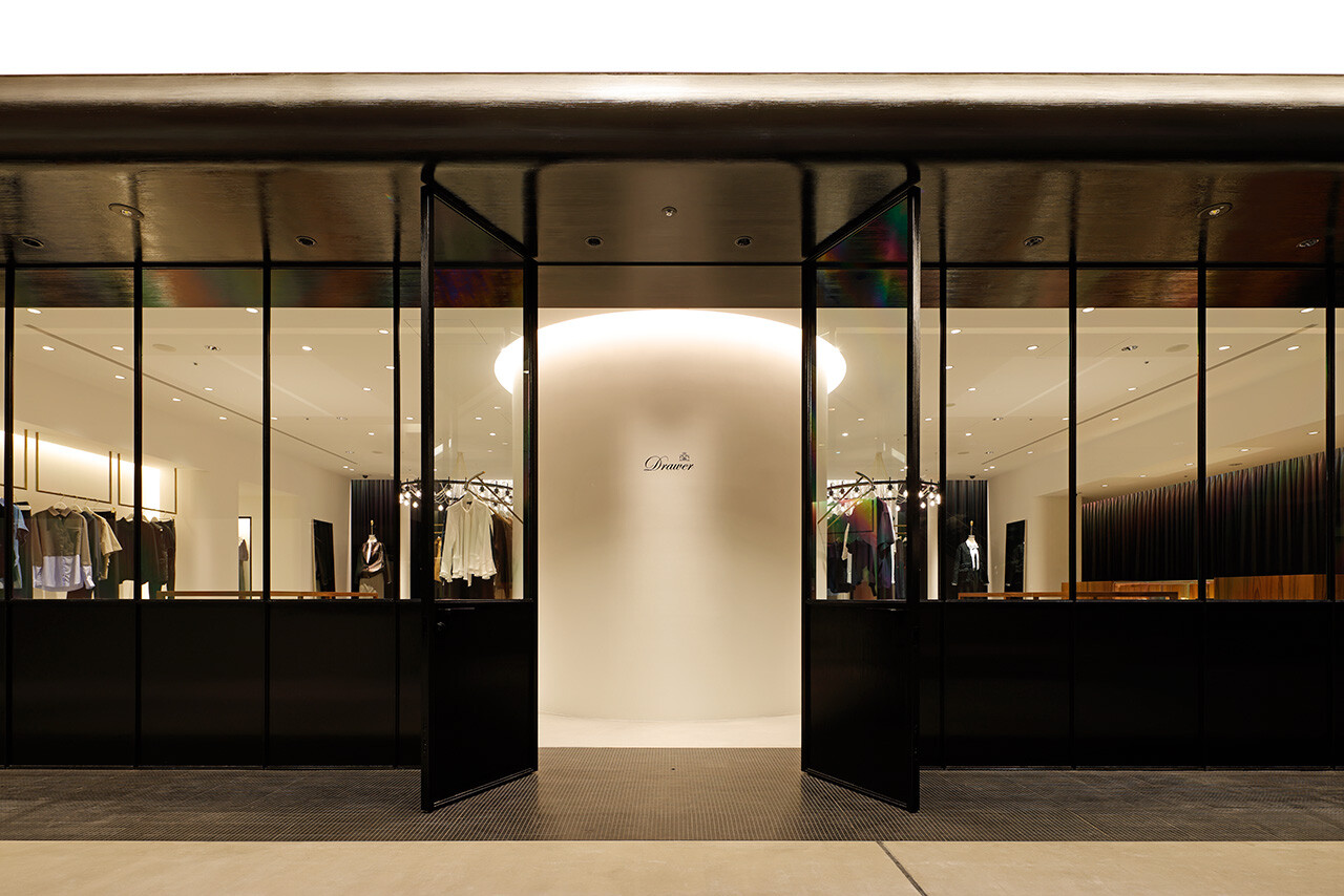 「引き出しの上段に上質なものを入れる」という、英国の古き良き風習を由来とする「DRAWER」。2003年のブランド発足とともに生まれた空間のアイデンティティはそのままに、2025年のLUMINE高輪ゲートウェイ店では、商業モールという環境から距離を置くように、ブティックというよりファッションデザイナーのアトリエの風景をイメージしながらデザインされた。