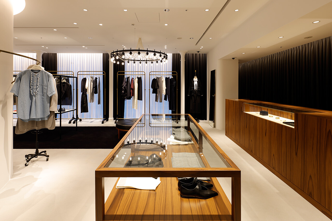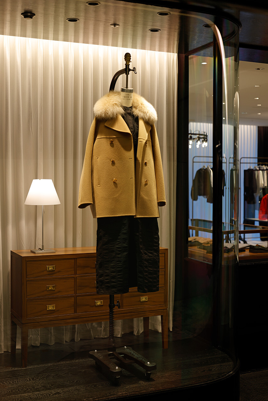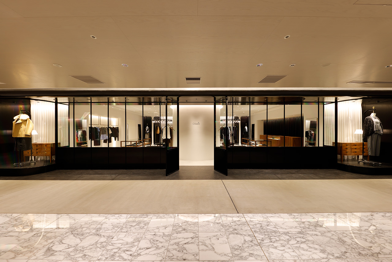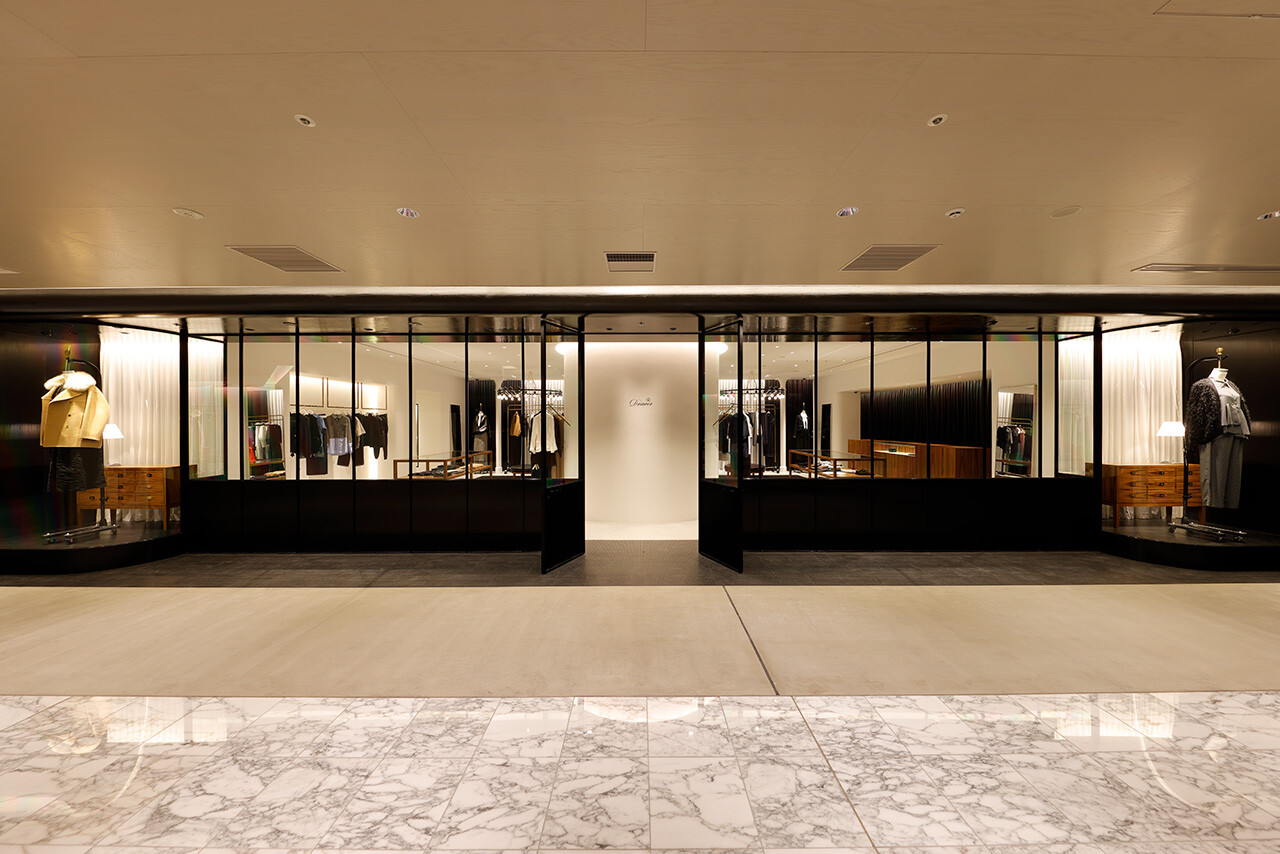 「引き出しの上段に上質なものを入れる」という、英国の古き良き風習を由来とする「DRAWER」。2003年のブランド発足とともに生まれた空間のアイデンティティはそのままに、2025年のLUMINE高輪ゲートウェイ店では、商業モールという環境から距離を置くように、ブティックというよりファッションデザイナーのアトリエの風景をイメージしながらデザインされた。