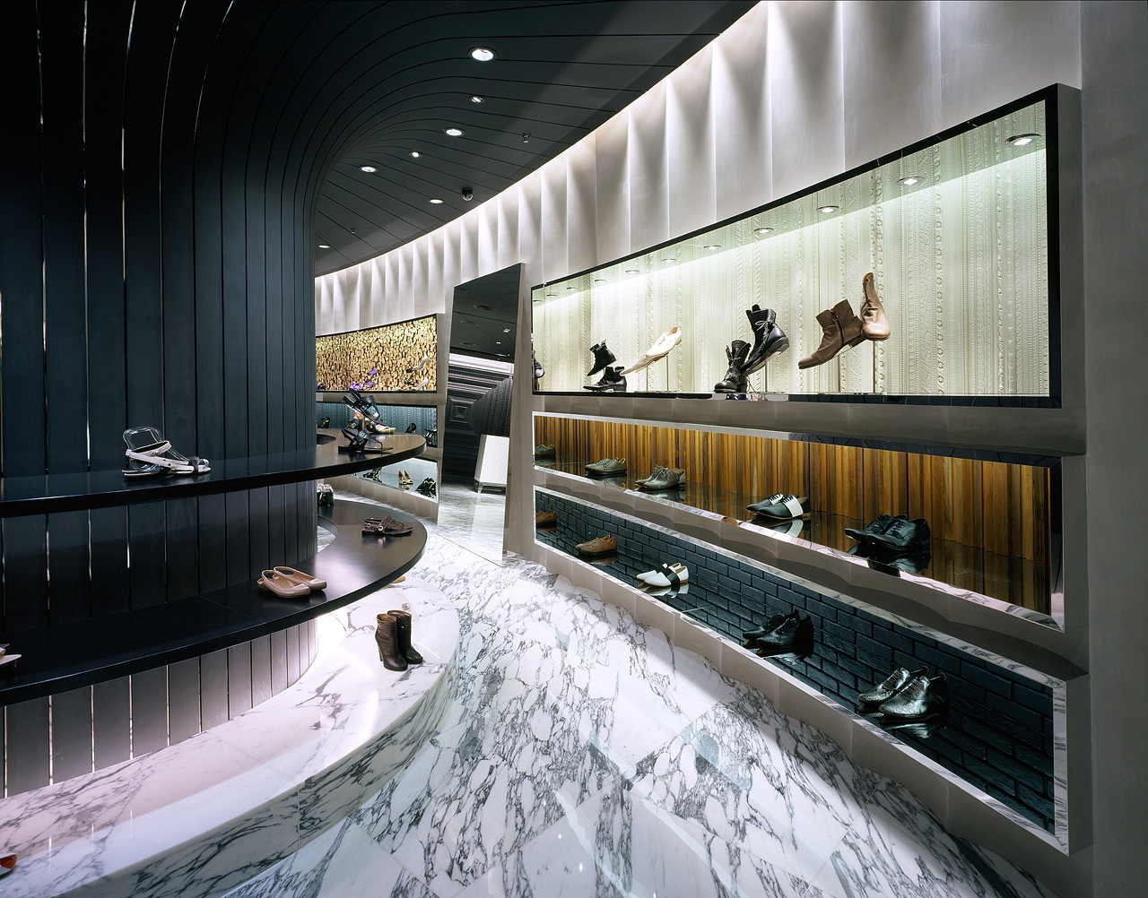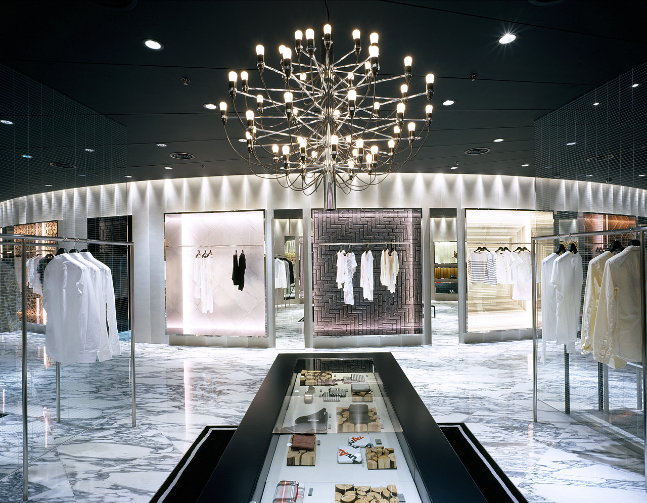 This is a boutique in Pacific Place, one of the largest shopping malls in Hong Kong. The design of the store makes positive use of the L-shaped space, while employing various materials such as old bricks, piles of firewood, and traditional frames as backgrounds for different categories of clothing. In addition to the dynamic nature of the interior that welcomes visitors with a variety of expressions as they proceed further, the mirror at the far end of the boutique extends the space and creates a joyful illusion as if the boutique stretches without an end.