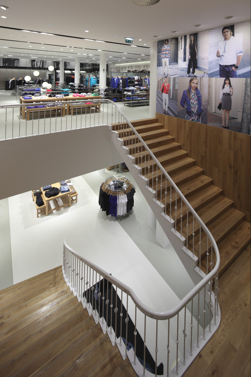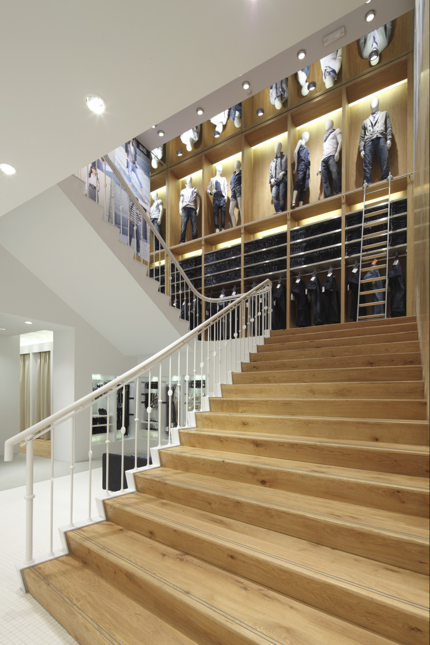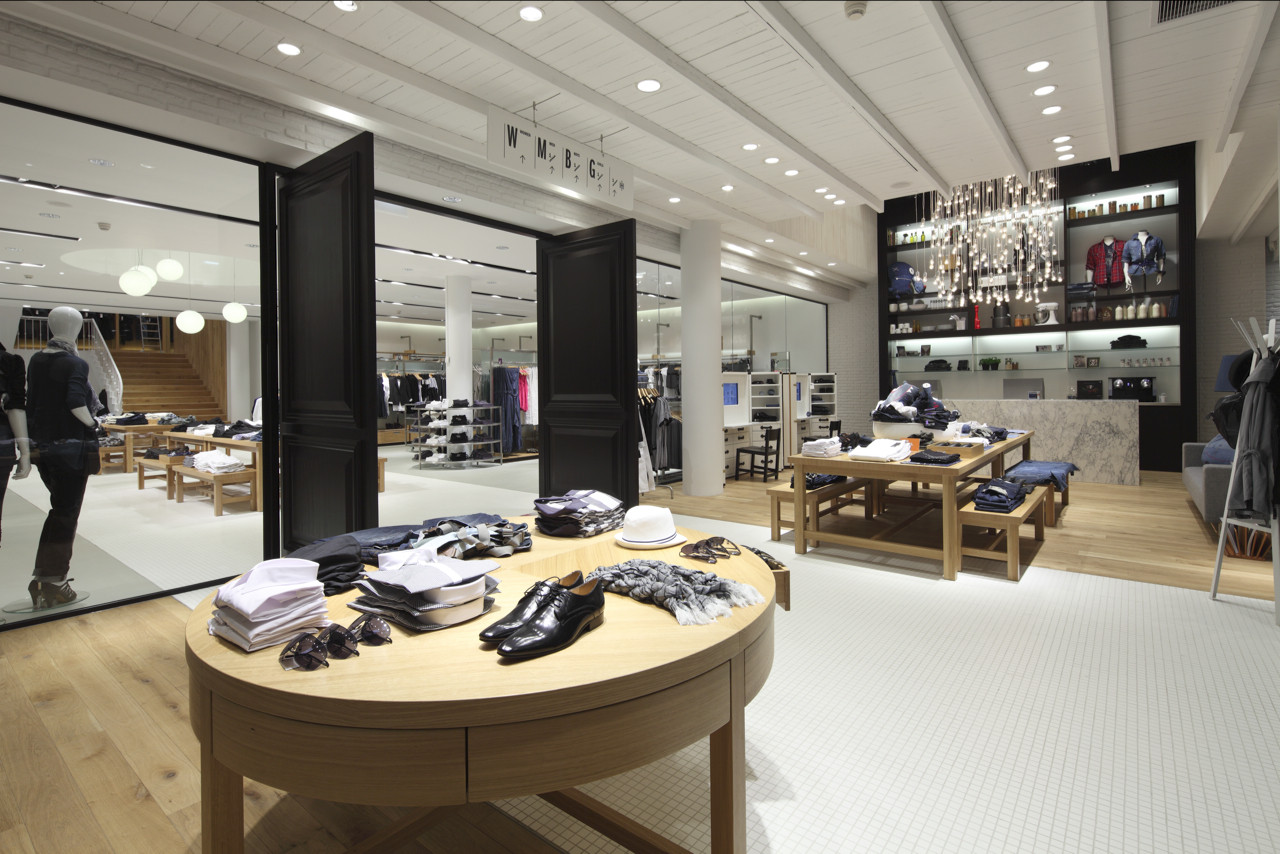 Katayama created a space to represent the home for Lisa and Chris, the imaginary model personalities for the free standing store for the European-based Dutch apparel brand WE. Reaching both out to the street and further inside the store from this space is a relaxed atmosphere that would be generated from a friendly environment as shared by family and friends surrounding a large dining table. The welcoming air of the entrance invites customers to casually swing by the couple’s home and then be drawn to the merchandise as a natural consequence.