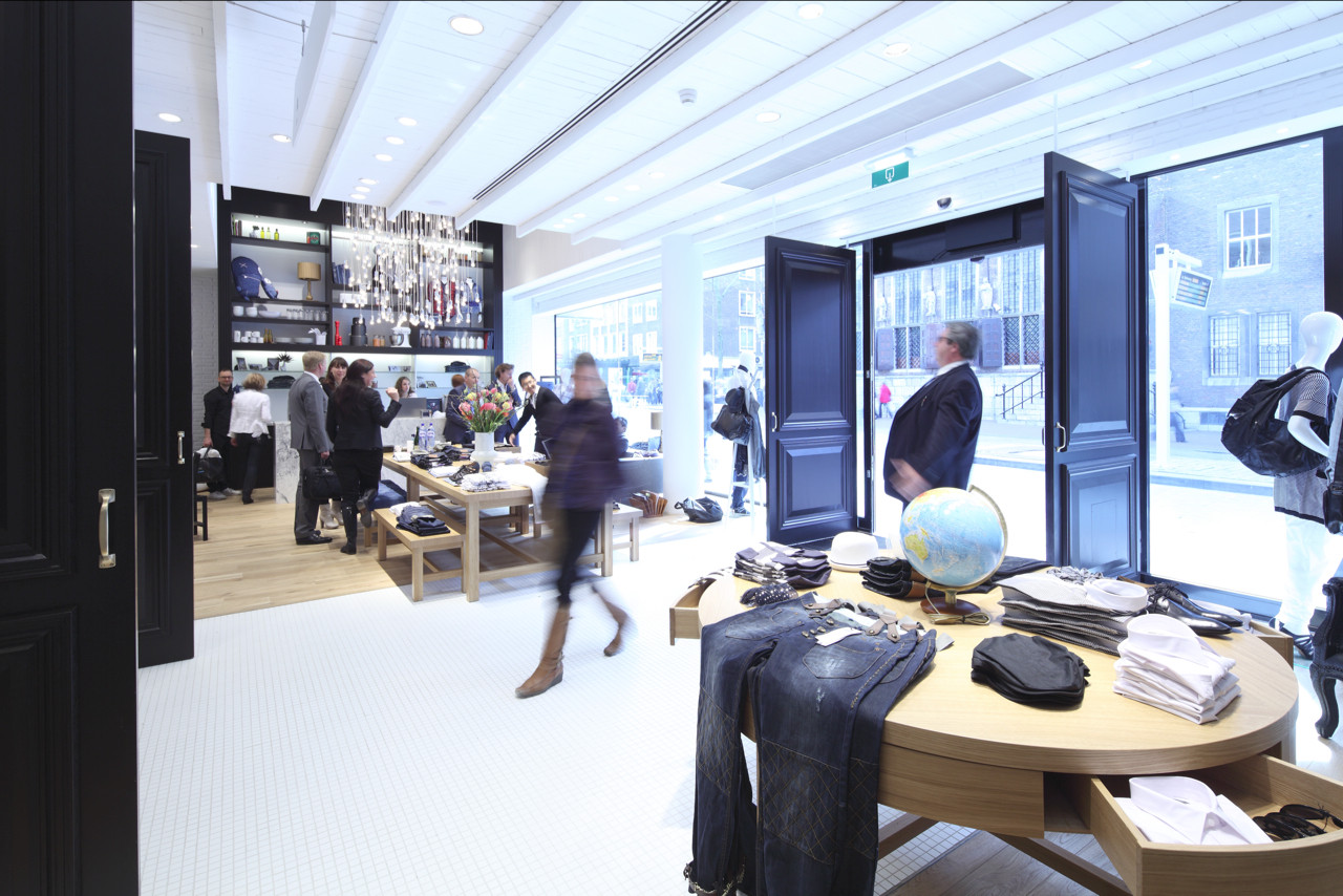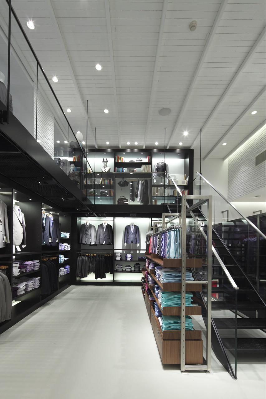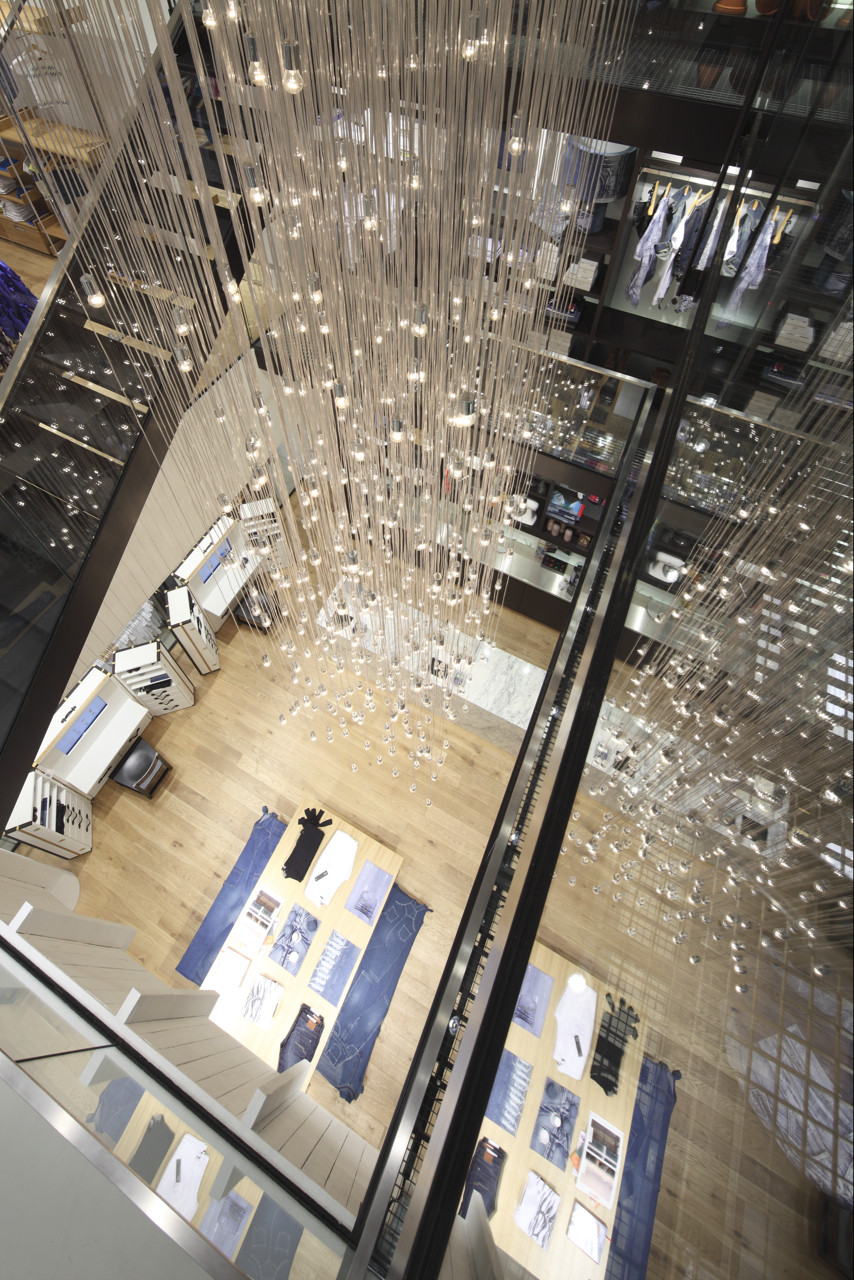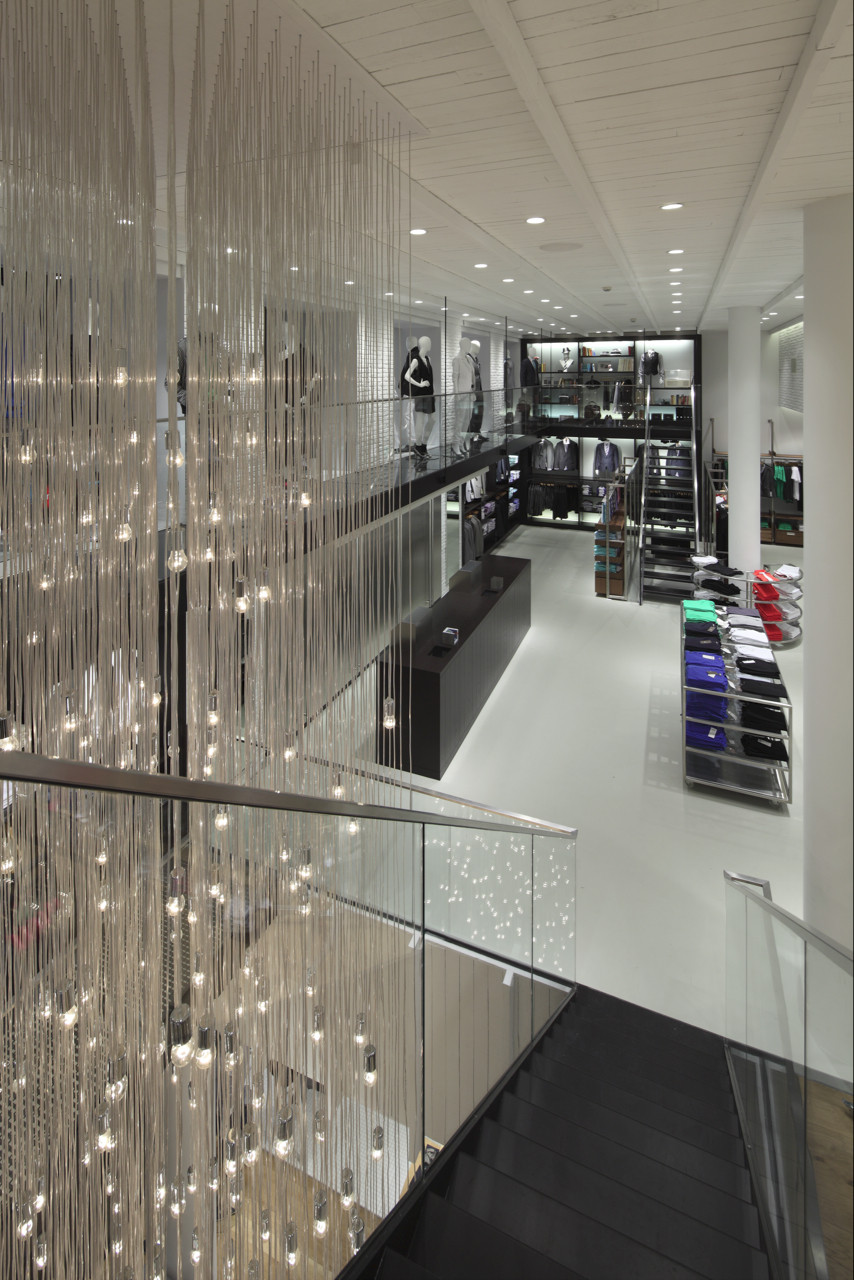 Katayama created a space to represent the home for Lisa and Chris, the imaginary model personalities for the free standing store for the European-based Dutch apparel brand WE. Reaching both out to the street and further inside the store from this space is a relaxed atmosphere that would be generated from a friendly environment as shared by family and friends surrounding a large dining table. The welcoming air of the entrance invites customers to casually swing by the couple’s home and then be drawn to the merchandise as a natural consequence.