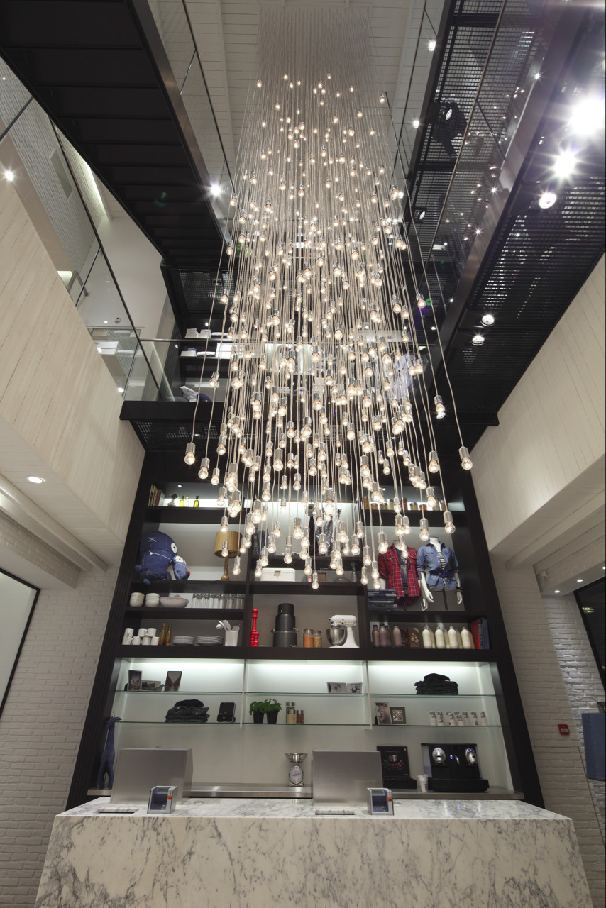 The imaginary home of Chris and Lisa. The kiitchen is turned into cashier area, and the chandelier hangs from the 2nd floor connecting the vertical space.