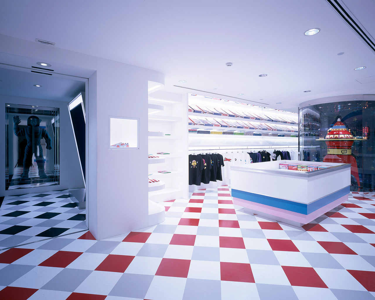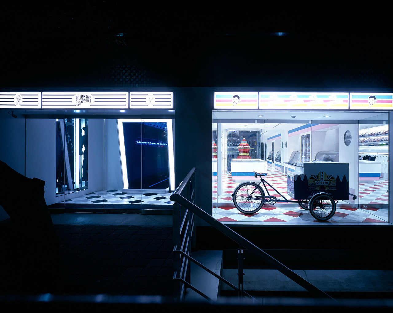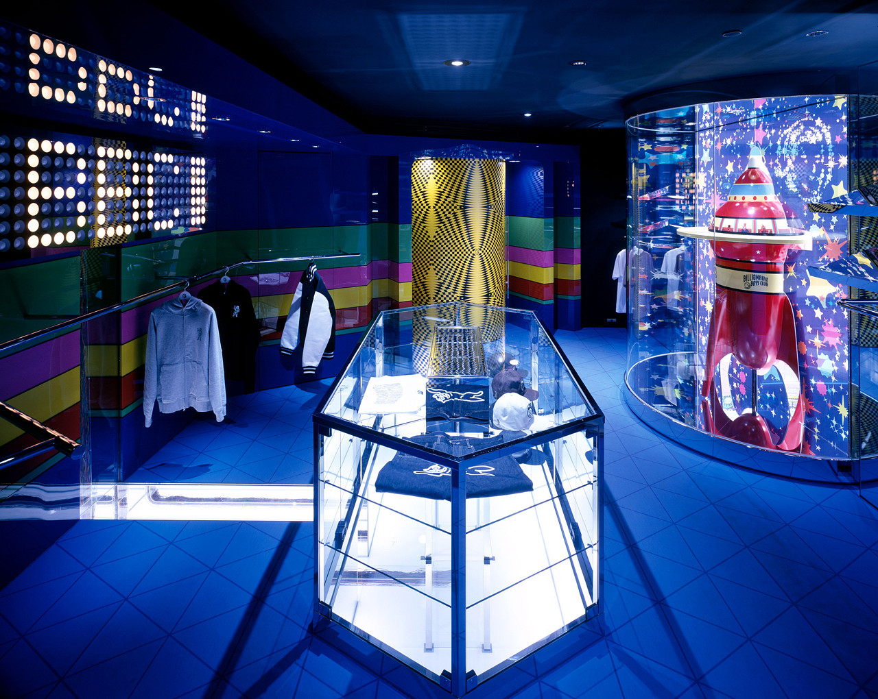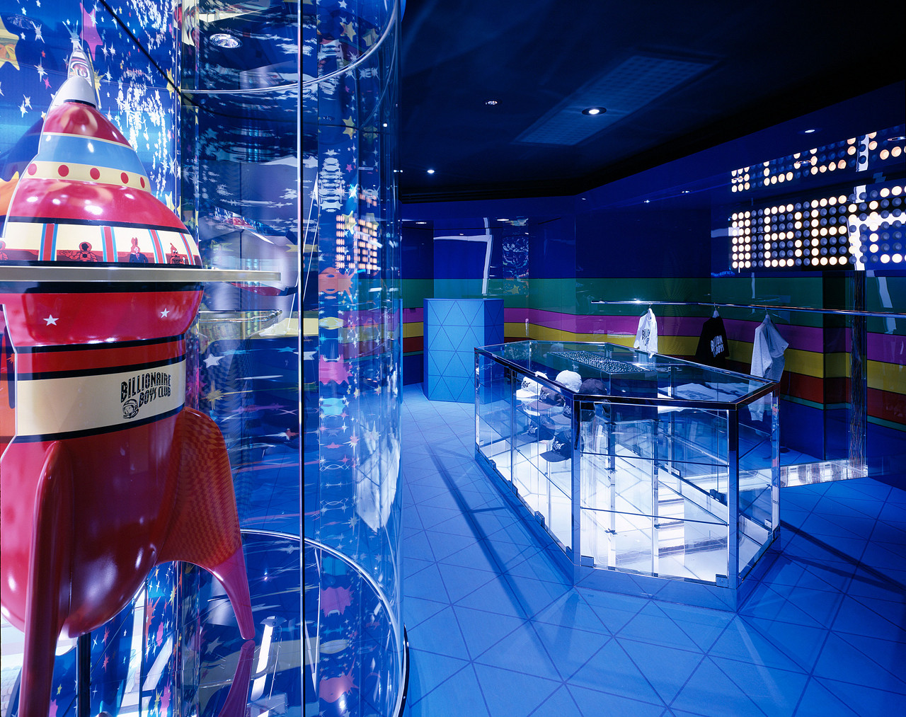 A collaborative project that sprouted from a conversation with NIGO®. While on one side, the taste of an ordinary west coast ice-cream parlor is extracted, sublimating its elements into retail store dècor, visitors are greeted by a life size BBC character object on the other side of the retro-pop tunnel. The two stores ad hoc coexist by sharing a rocket figure placed in the center of the boutique.
