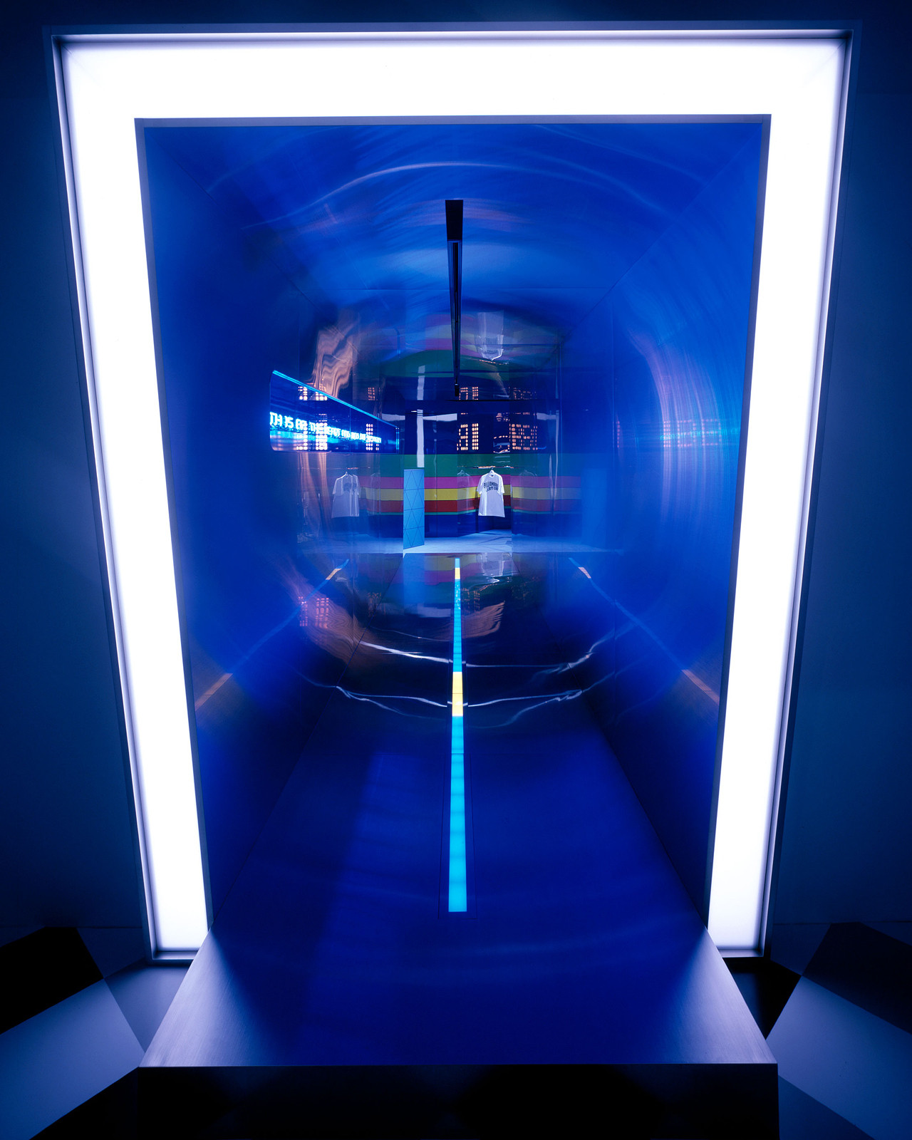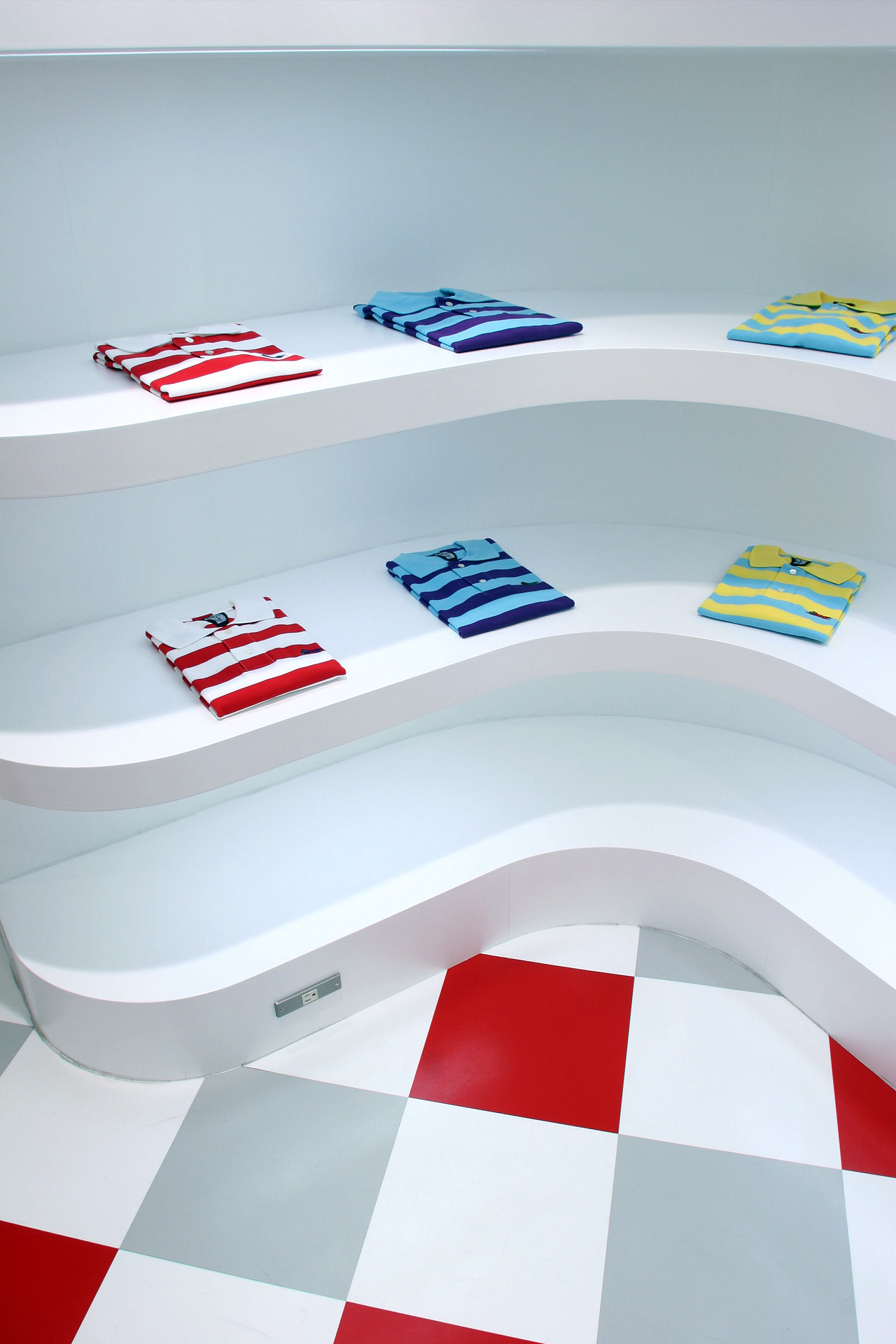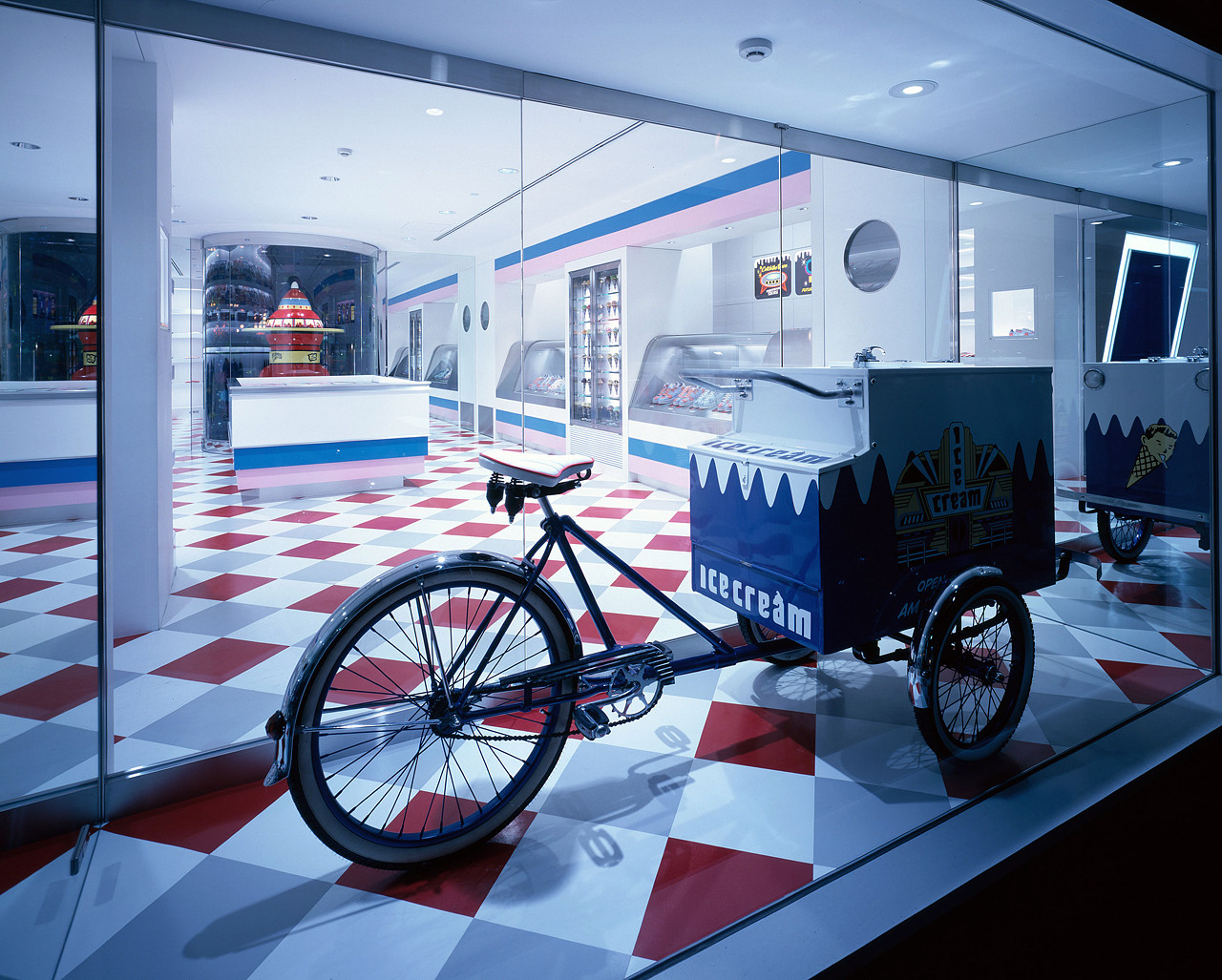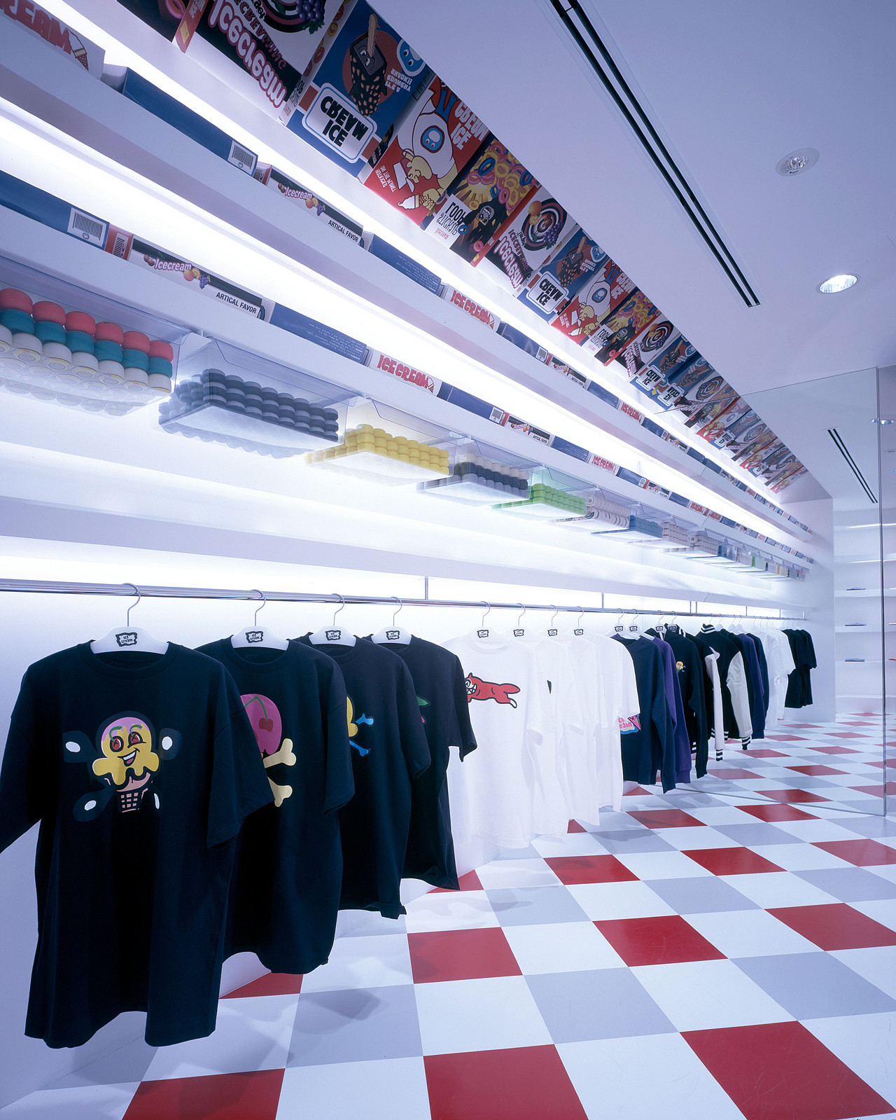 A collaborative project that sprouted from a conversation with NIGO®. While on one side, the taste of an ordinary west coast ice-cream parlor is extracted, sublimating its elements into retail store dècor, visitors are greeted by a life size BBC character object on the other side of the retro-pop tunnel. The two stores ad hoc coexist by sharing a rocket figure placed in the center of the boutique.