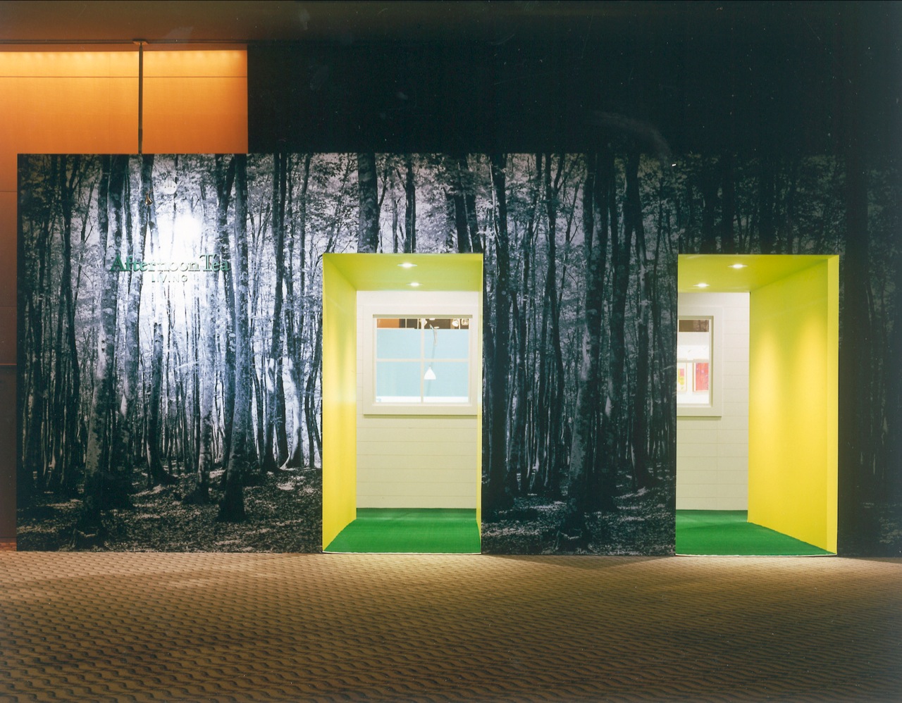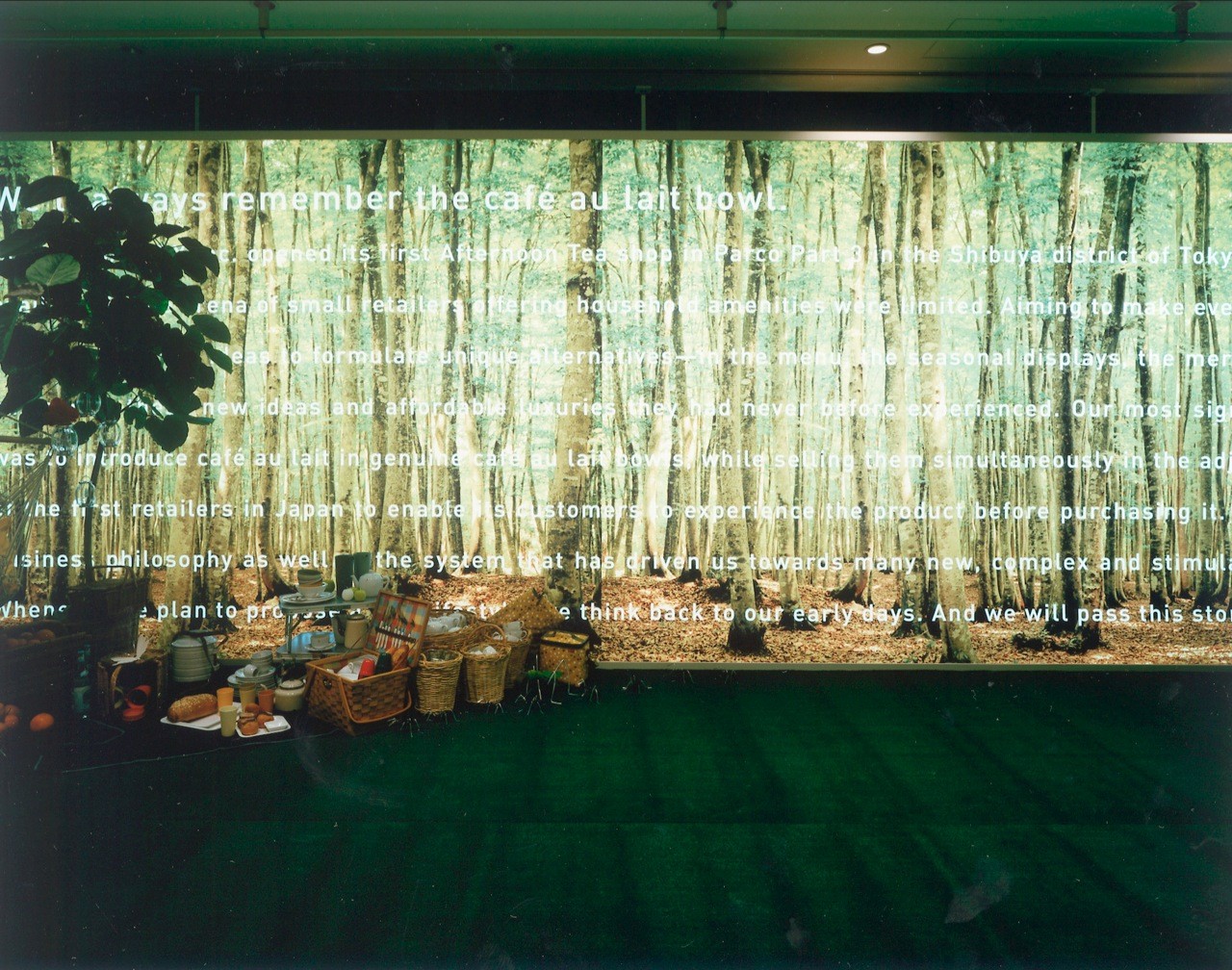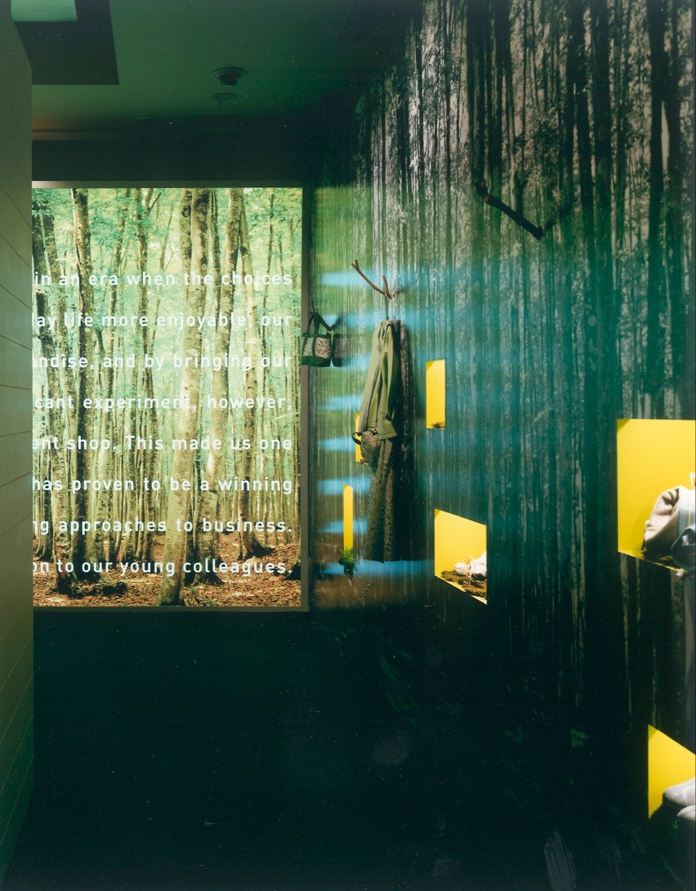 With its overall image being a house in a forest, products are exhibited in different "rooms" of the house by function--the kitchen, dining room, living room, bedroom, and bathroom--evoking actual situations. Everything is represented in symbols, and each space is characterized by the application of prints for the forest and different colors for the rooms.