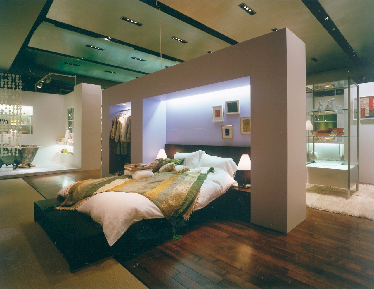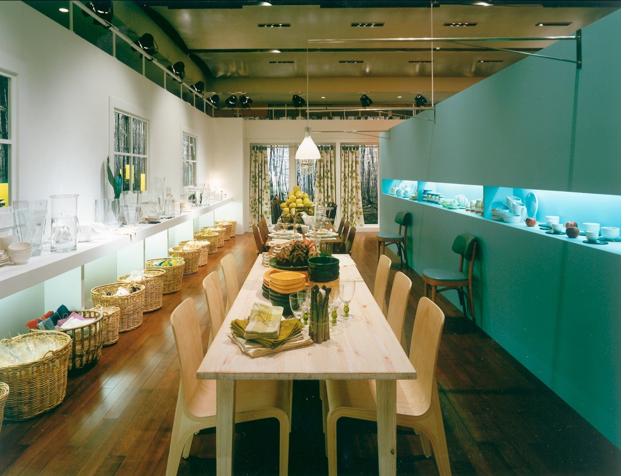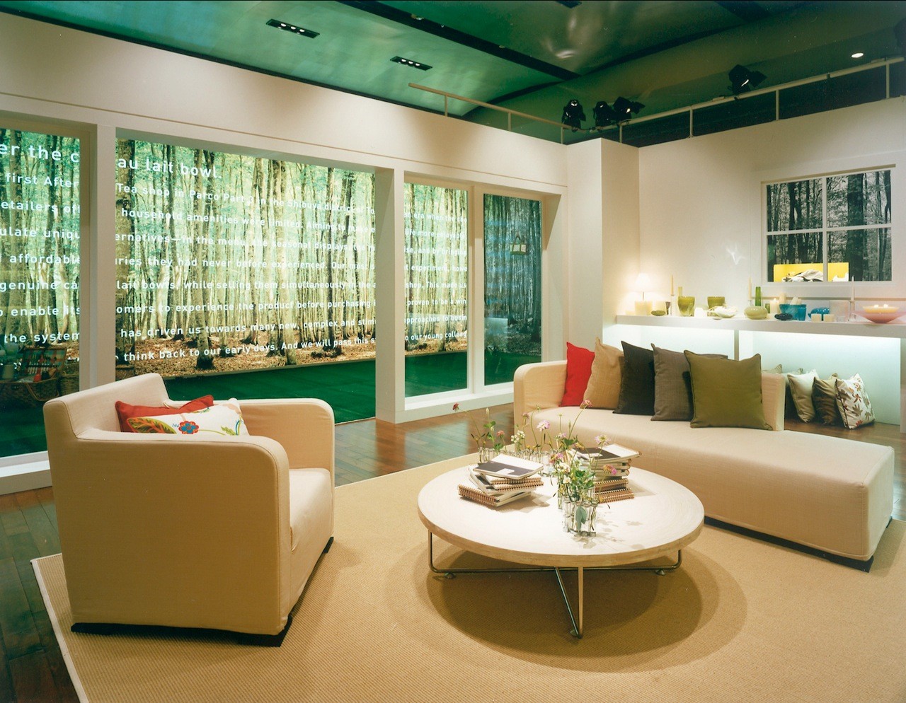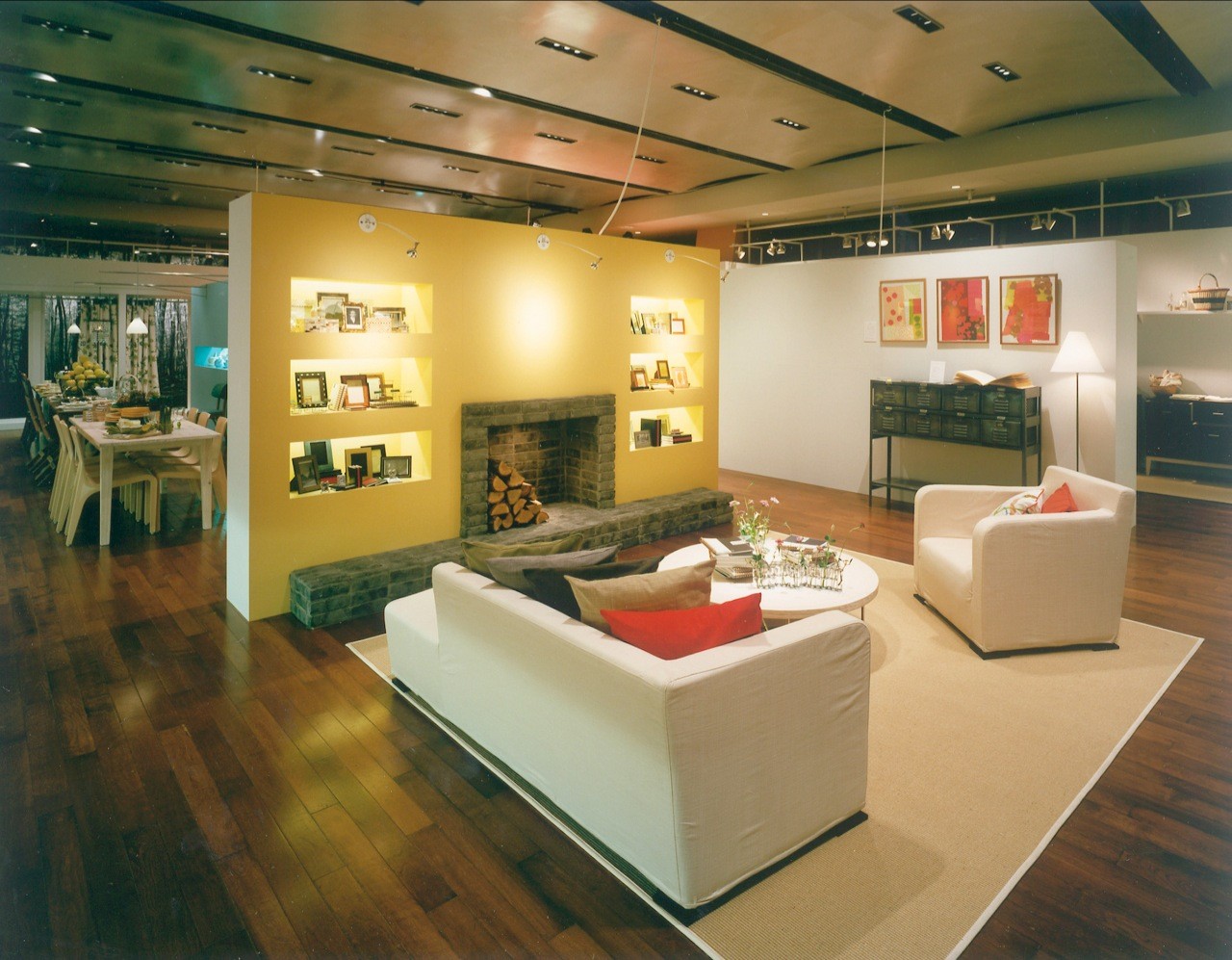 With its overall image being a house in a forest, products are exhibited in different "rooms" of the house by function--the kitchen, dining room, living room, bedroom, and bathroom--evoking actual situations. Everything is represented in symbols, and each space is characterized by the application of prints for the forest and different colors for the rooms.