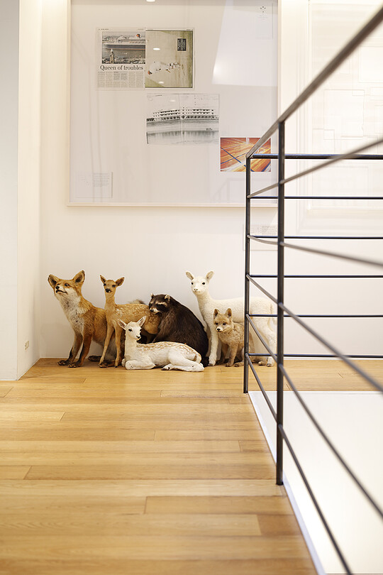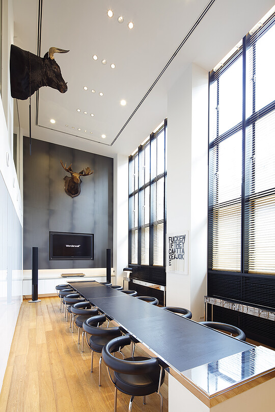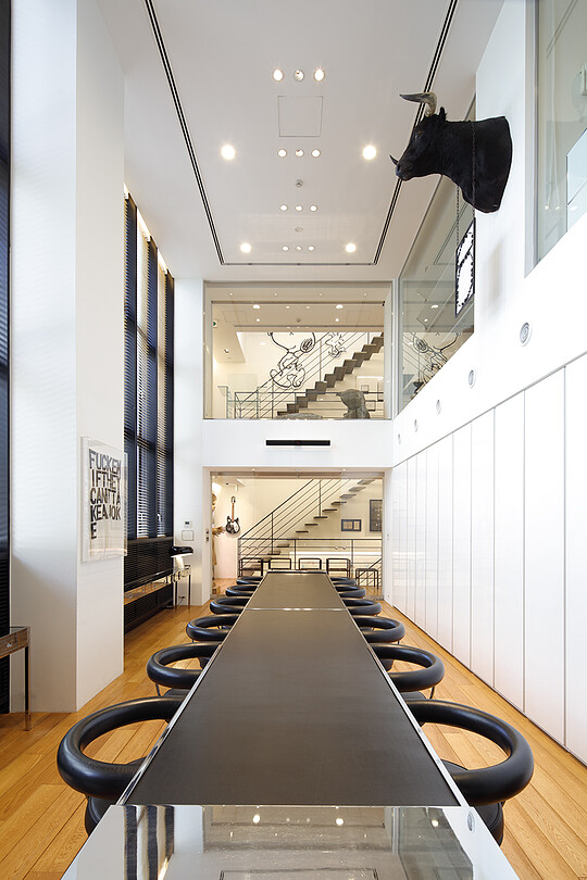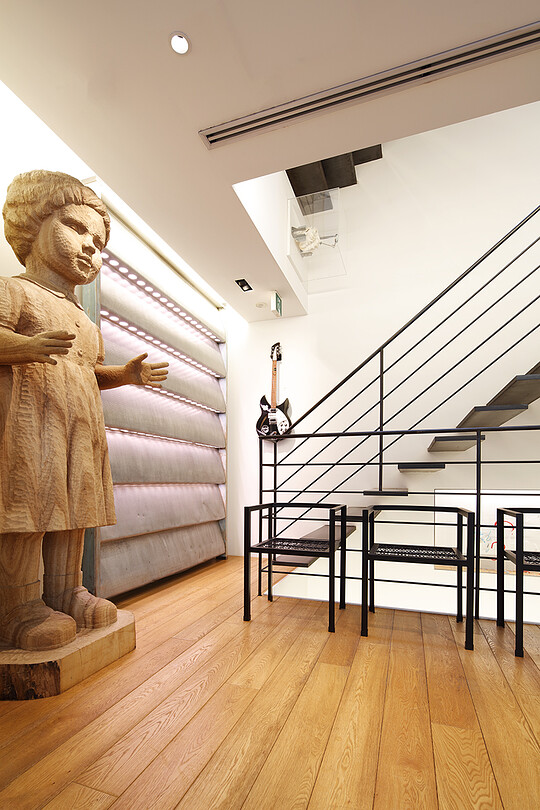 Katayama designed both the architecture and interior design of his new office for Wonderwall. The three story high building with additional two floors below ground was designed based on Katayama's idea of what he considers basic and standard. In designing this office, functionality, vertical continuity, and a certain sense of tension were key elements that was important to Katayama while it also needed to posses the identity of his firm and be an exhilarating space for him to work in. Such varying elements coexist in harmony, seamlessly unifying architecture and interior design to create a perfectly natural space and hence an optimal state.