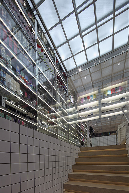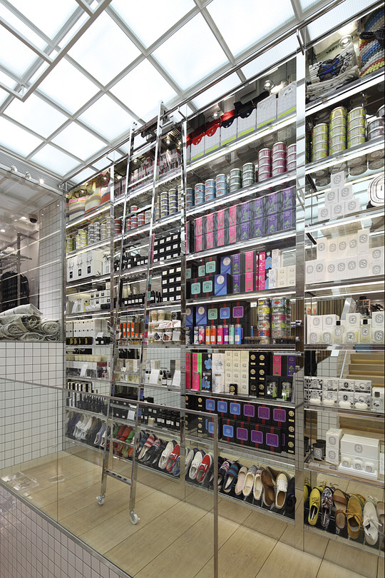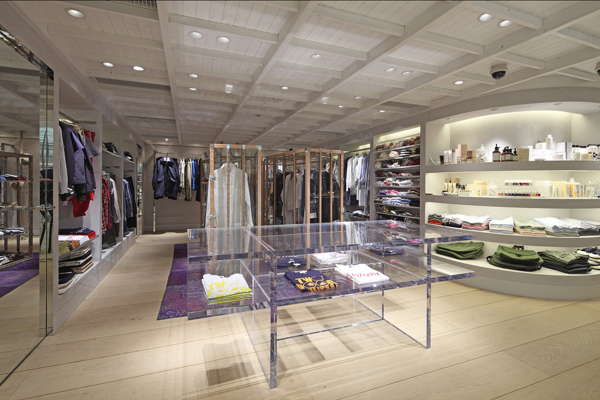 The concept behind the interior design of this luxury multi-brand boutique is centered on the idea of shopping for luxury items, which housed in an environment that emanates the enjoyment, the surmise and the ease of a supermarket. An energetic sense of vitality is created though the creation of shops with in shops with merchandise displayed even in the landing area of this two story shore. One with see an ‘antique shop’ a ‘pharmacy’, or a bar all in one boutique. The inside holds a natural atmosphere despite the frequent use of hard materials.