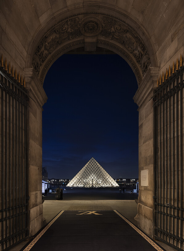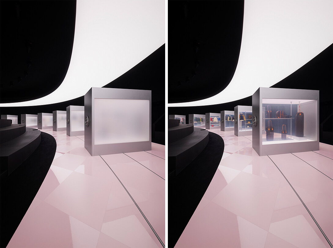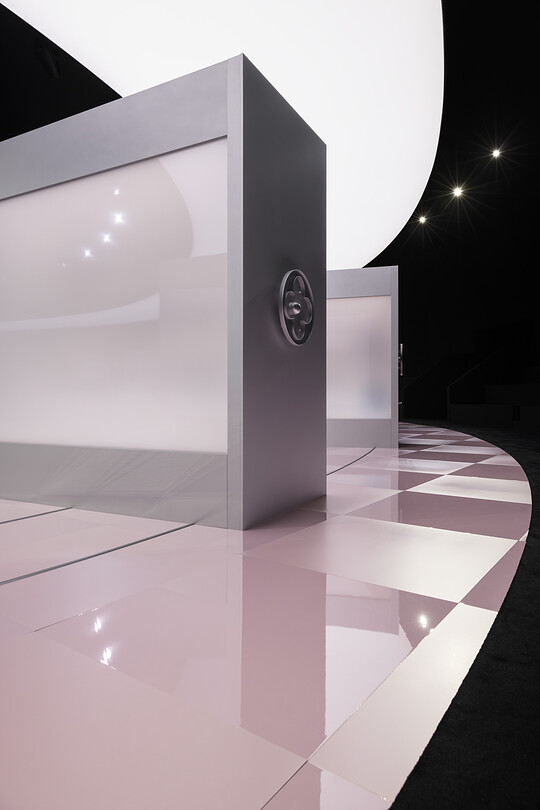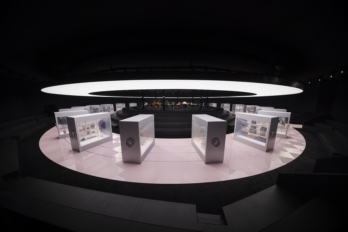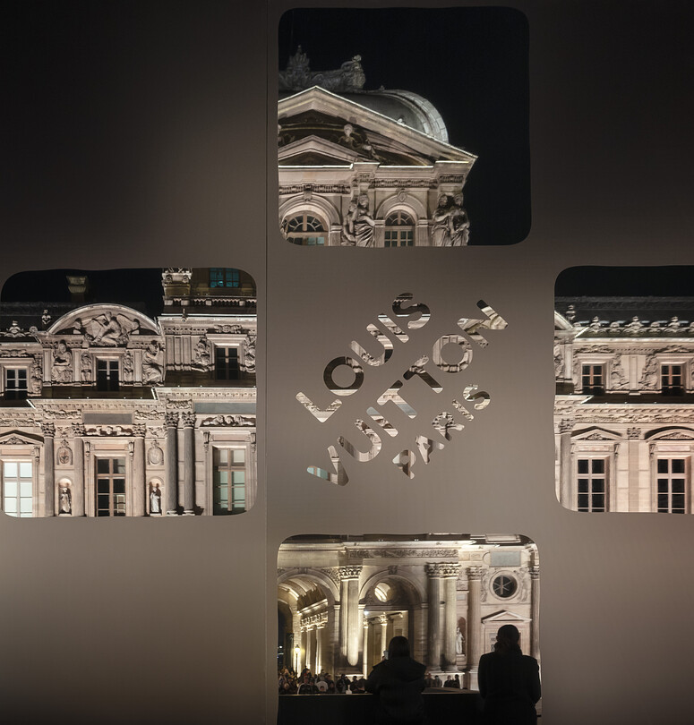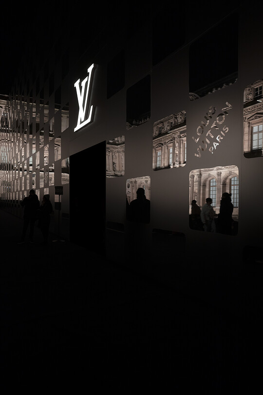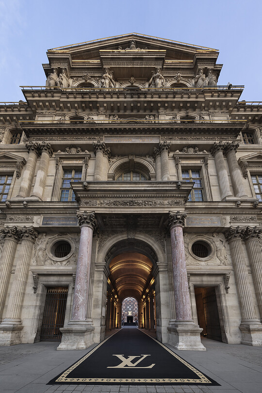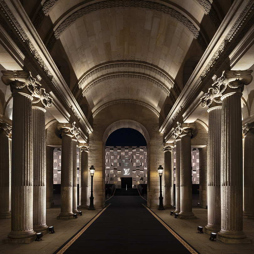 The venue was a large tent erected in the Louvre Museum’s Cour Carrée. With “Japan,” “Archive,” and “Endless Discovery” as key themes, the design explored the relationship between Louis Vuitton and Japan, reinterpreting historical elements through a contemporary lens. Inspired by the ritual rebuilding of Ise Shrine every 20 years, the ensō (Zen circle), and the interplay of light and shadow, the space embodied the essence of Japanese spatial philosophy.
