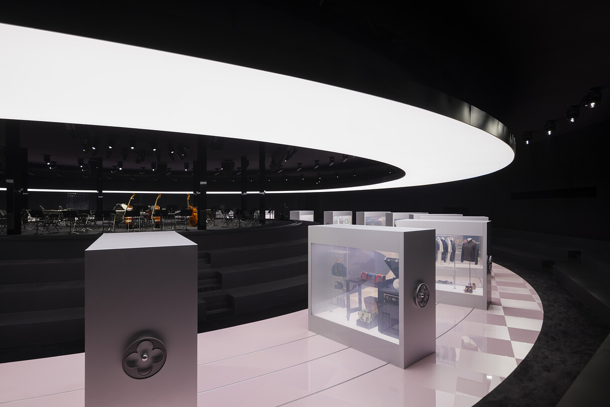 At the entrance, mirrors adorned with a reinterpreted Damier pattern by NIGO®️ reflected the historic architecture. Inside, a circular runway, a ring-shaped illuminated ceiling, and archive boxes arranged in a radial pattern filled the space. These elements showcased the inspirations behind Pharrell, NIGO®️, and Louis Vuitton, while also serving as the backdrop for the show. On the central stage, an orchestral performance took place. Combined with a narrative-driven production, the hybrid spatial design—seamlessly merging the fashion show and archival exhibition—brought to life a one-of-a-kind environment that expressed the concept of “Endless Discovery.”