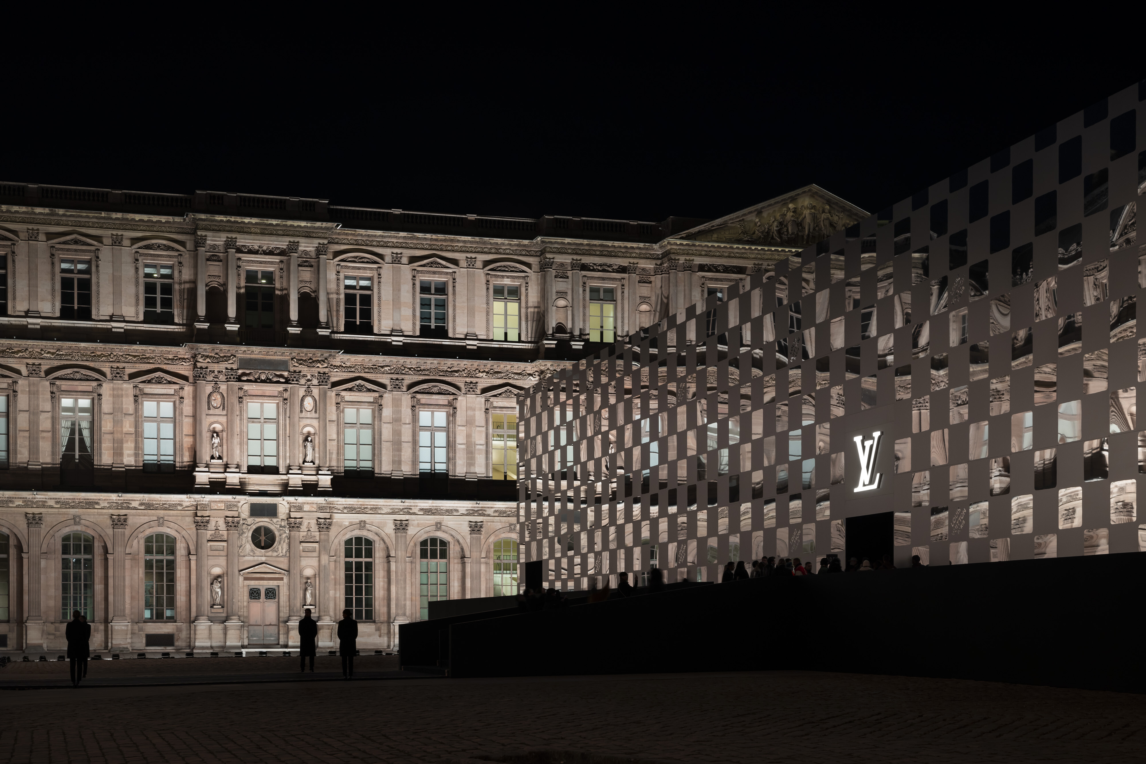 The venue was a large tent erected in the Louvre Museum’s Cour Carrée. With “Japan,” “Archive,” and “Endless Discovery” as key themes, the design explored the relationship between Louis Vuitton and Japan, reinterpreting historical elements through a contemporary lens. Inspired by the ritual rebuilding of Ise Shrine every 20 years, the ensō (Zen circle), and the interplay of light and shadow, the space embodied the essence of Japanese spatial philosophy.